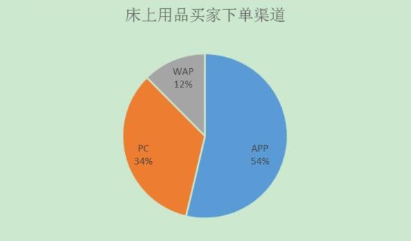 床上用品行业买家下单渠道方面APP占比54%,PC端下单占比34%,WAP占比为12%。